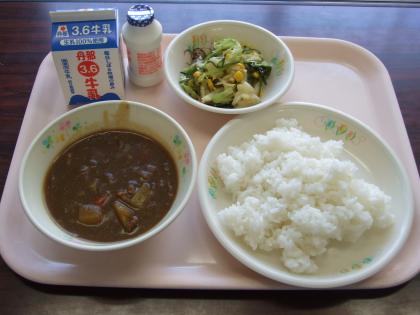 今日のメニュー ビーンズカレー 海藻サラダ アシドミルク ご飯 牛乳