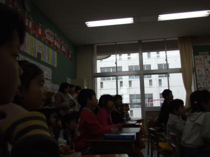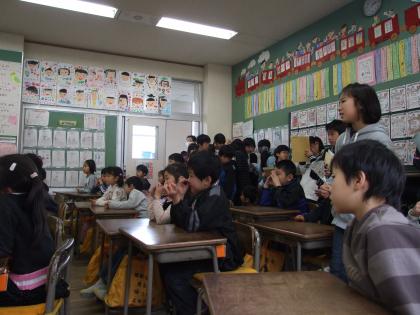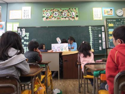 5時間目に、5年生が1年生に、「地球環境を守ろう」と呼びかけました。紙芝居などを使って、わかりやすく説明することができました。