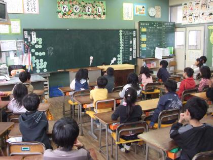 5時間目に、5年生が1年生に、「地球環境を守ろう」と呼びかけました。紙芝居などを使って、わかりやすく説明することができました。