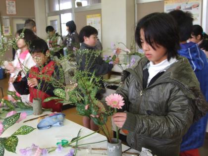 六年生が総合学習で華道を通して日本の文化を学んでいます。