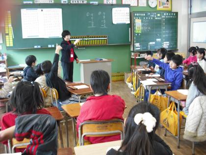 3年生は、そろばん教室を開きました。小川先生の指導のもと、楽しそうに学んでいます。