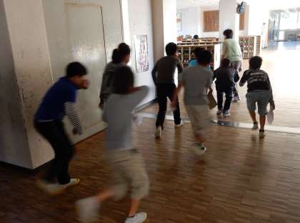 実際の火災の怖さは経験しない方がいいにきまっていますが、知っていないと、万が一の時に、自分の命を守る力はつきません。煙の特性・怖さや避難時の煙への対応策などを教え、それを想像しながら避難させました。口にハンカチや衣服の袖などを当てて、体を低くして校舎内を移動しました。