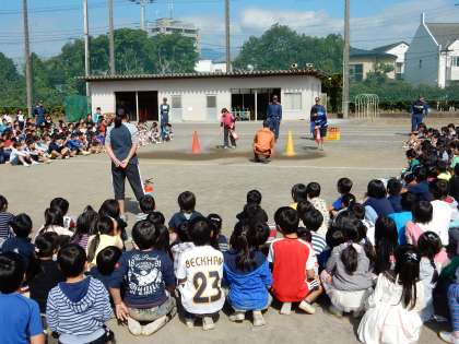 南消防署の皆様がお仕事の合間を縫って来てくださり、教職員の通報訓練や代表教師・代表児童による消火の実演などを指導してくださいました。火災や避難行動についての分かりやすい講話もしてくださいました。