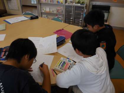 新聞に色を塗った方がわかりやすいと、刷り上がった新聞に色鉛筆で1枚1枚色を塗っています。