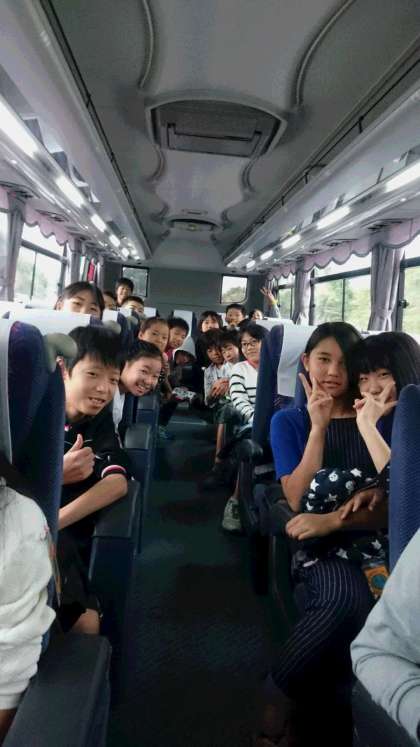いよいよ修学旅行に出かけます。3組のバスの中ではリクエスト曲が流れています。元気に行ってきます。