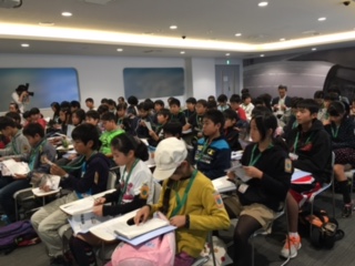 JALメンテナンスセンターで見学をしています。ビジネスクラスのシートに座って気持ちよさそうにしていました。