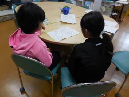 ポストに投函されたおなまみに一生懸命返信を考える5年生です。