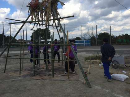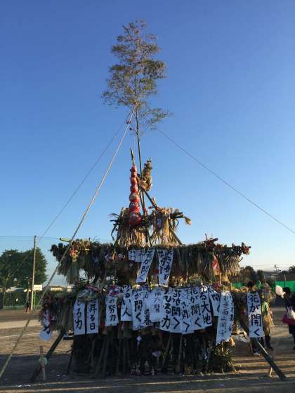 どんど焼きのやぐらは男性理事が下石田と木瀬川のお宅から竹を取りに行くところから始まり、試行錯誤を繰り返しながら一生懸命組み上げ、工夫をこらして立派なやぐらが完成しました。
