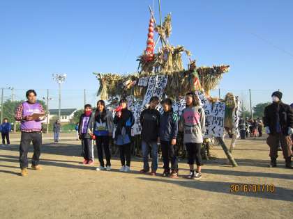 どんど焼きの開会式は、各町内から選ばれた児童5人が元気に挨拶をして、その後にやぐらに点火しました。火は勢いよく燃え上がり、みんなの書初めが天高く舞い上がりました。