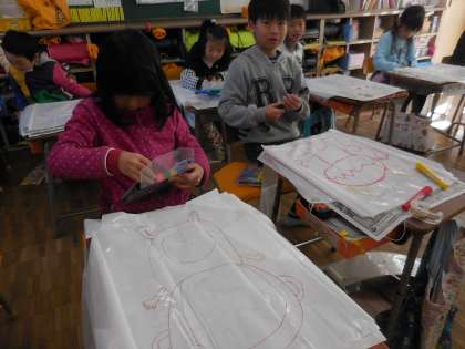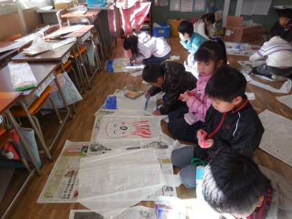 1年生が、生活科のふゆのあそびの学習で、ぐにゃぐにゃたこ作りをしました。