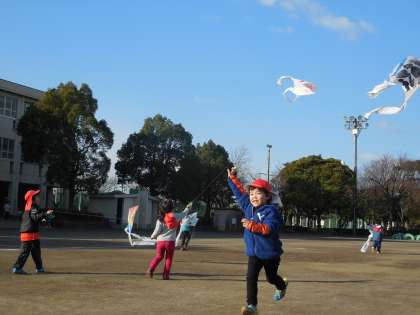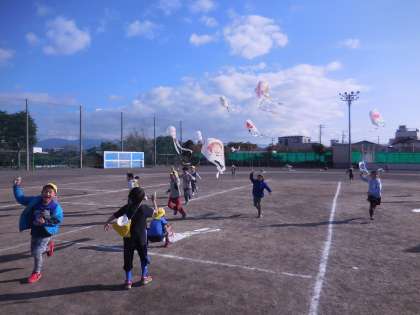 1年生が、先日図工の時間に作った凧を、運動場であげました。
