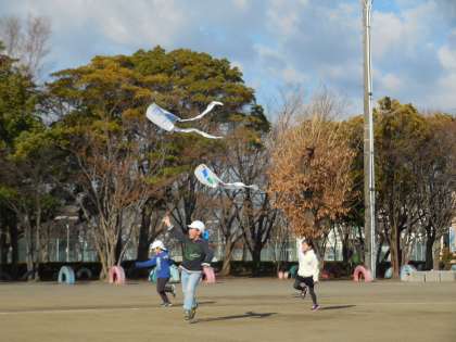 1年生は凧揚げの他にも、けん玉やお手玉などの昔の遊びにも挑戦しています。