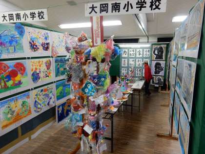 さて、大岡南小でも、子どもたちの図工・書写作品が華やかに展示されています。「ほくの妹のが展示されてるんだよ。これだよ」と言って誇らしげに教えてくれる子もいました。大岡3校の作品のほかにも、地元の各園や各種社会教育団体等の作品も見事です。