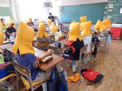 事後には、防災の日の元となった大正12年9月1日11:58の関東大震災の話を聴きました。昨日と今朝は熊本で震度5弱や震度4の地震が再び発生しています。いつ起こるかわからない地震です。たとえ1年生でも、泣かないで、自分で自分の命を守る練習が必要です。学校ではどうするかわかってきましたが、登下校中や家ではどうするのか、おうちの人ともよく話をしておくことが大切です。−−そんな話も聴きました。