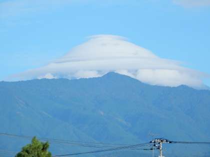 富士山がいつもの笠雲以上にたくさんの雲をまとい、まるで宇宙人基地のドームのようでした。
