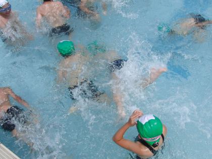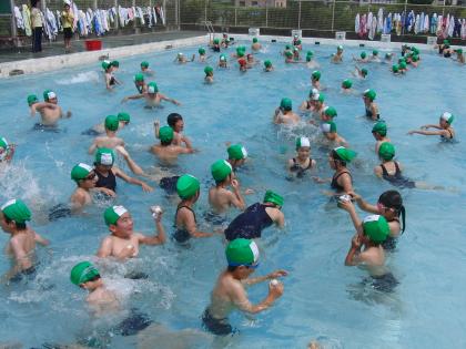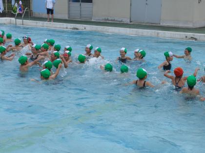 子どもたちは、今年の水泳のめあてを心に決めたあと、ボール拾いなどのゲームを思いっきり楽しみました。