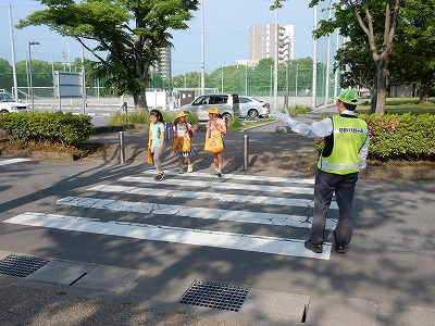 地域のボランティアさんに見守られての登校です。