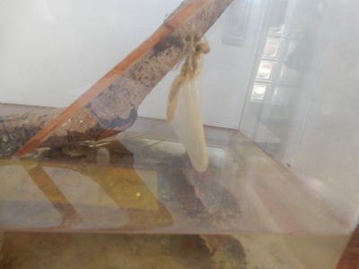 朝、校舎内を回ると4年の教室前の廊下にある水槽で、トンボが羽化していました。