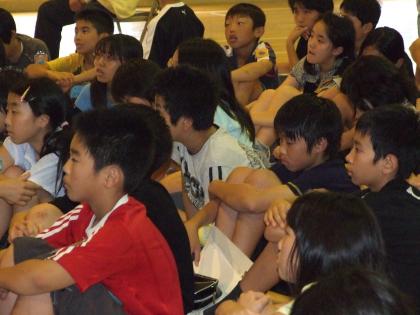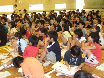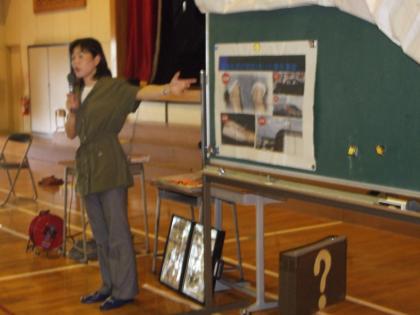 6年生は、体育館で「薬学講座」を実施しました。薬剤師の山形先生、サポートセンターの深沢さんを招いて、薬物の害について勉強しました。