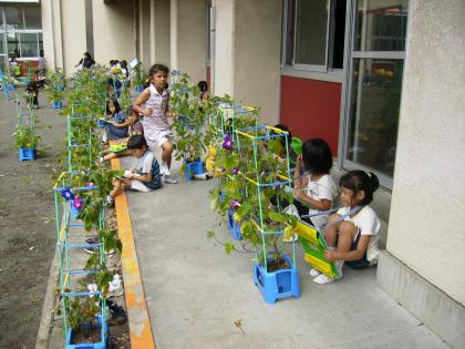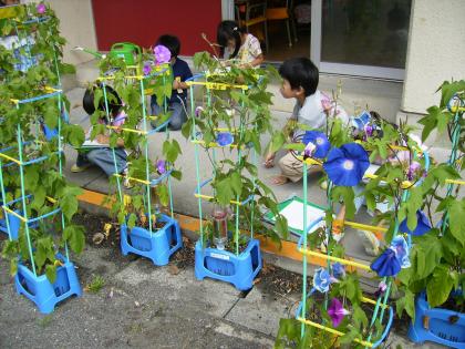 朝顔が、毎朝たくさんの花を咲かせています。今日は、花やつぼみの様子を観察しました。