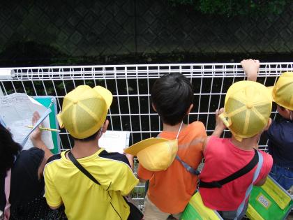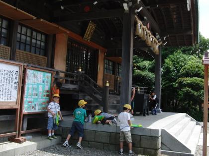日吉を調べるグループは「ろうにん川」「ひえだ神社」地域の公園や公民館を中心に見て歩きました。