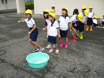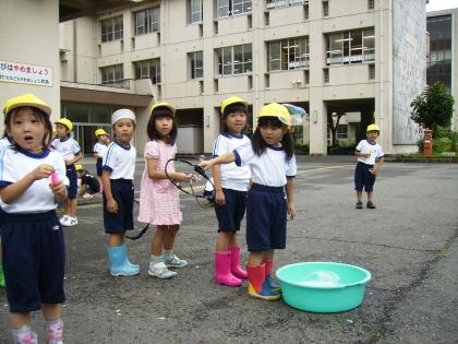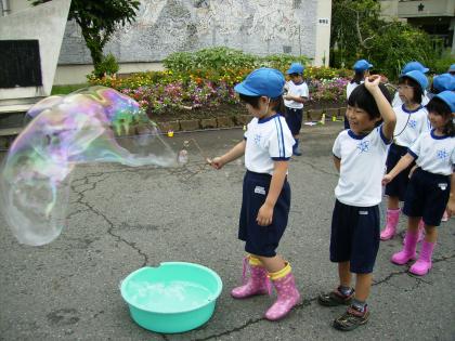 ストロー、うちわ、針金ハンガー・・・いろいろな道具でシャボン玉遊びを満喫しています。