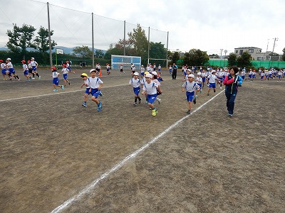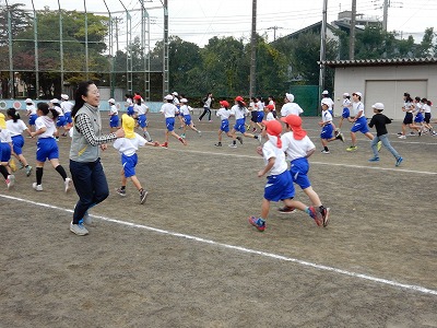 朝のかけ足の時、先生方は、いろいろな形で子どもたちを指導しています。