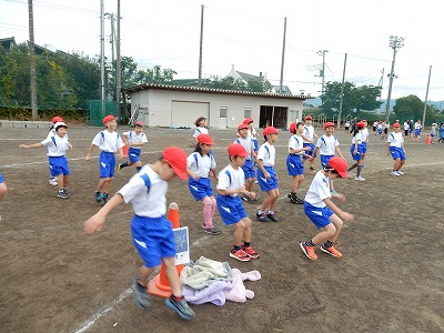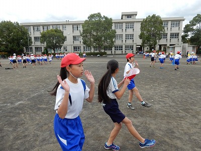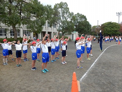 体育委員会の子どもたちは、低学年のクラスの前で見本となる動きを示してくれていまする