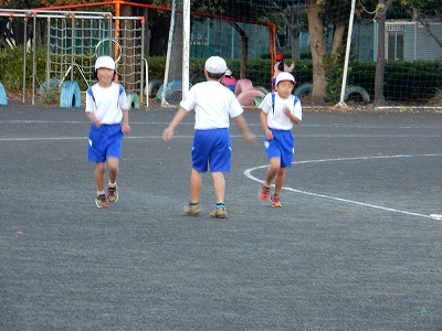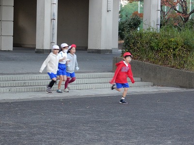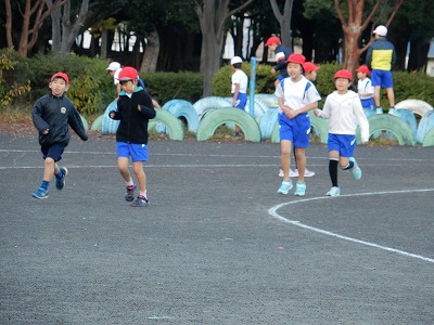 体育着に着替えて運動場に出て、かけ足運動前の自主マラソンに取り組んでいました。