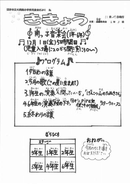 12月1日(金)の5時間目に、南っ子音楽会が開催されます。