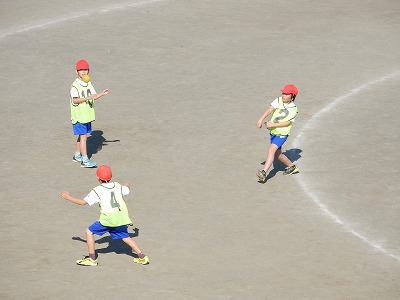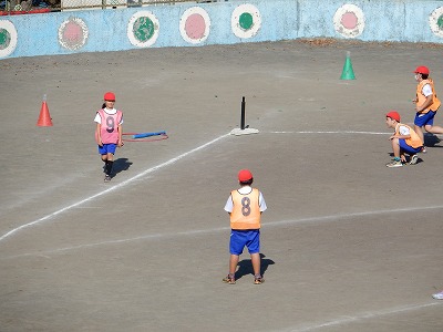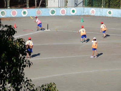 今、外体育ではベースボール型ゲームの「バックホームゲーム」をやっています。最初は、なかなか上手に打てなかったり、投げられなかったりした子もいたのですが、今では、全員がゲームに夢中になって取り組んでいます。