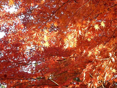 手前から、茶色、赤、黄色の葉が落ちていました。