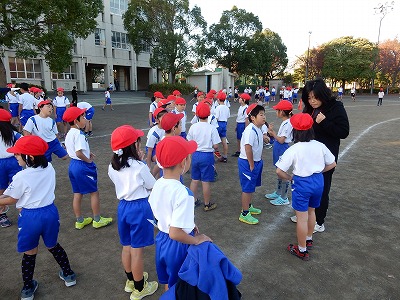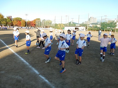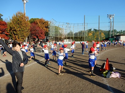 ジンギスカンで体を温め、健康観察の後、ラジオ体操第一で体をほぐしました。