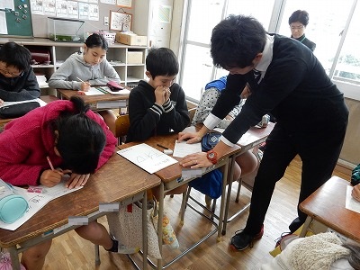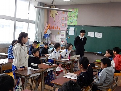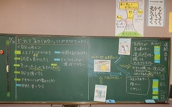 『校内マラソン大会』という資料を読みながら、あきらめないことの大切さについての考えを深めました。