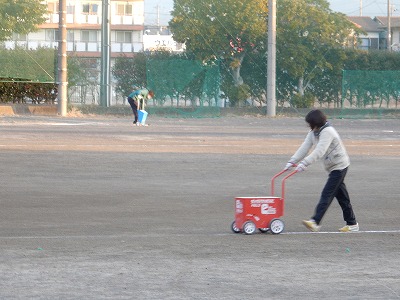 先生方は、運動場にラインを引いていました。