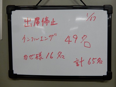 インフルエンザによる欠席者49名(昨日と比べ+12)、風邪様の症状での欠席者が16名(同−5)、合計65名(同+7)が欠席しています。