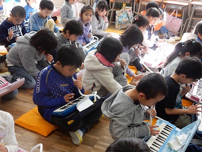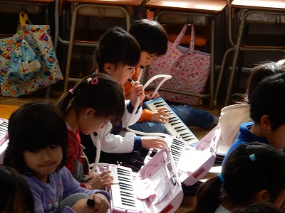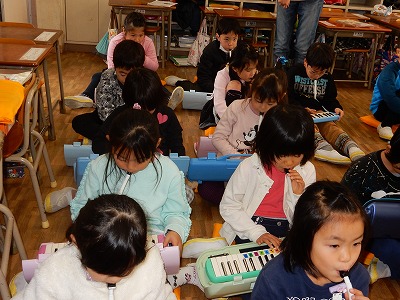 3クラスがメロディーを分担して、リレー方式で鍵盤ハーモニカを演奏しました。
