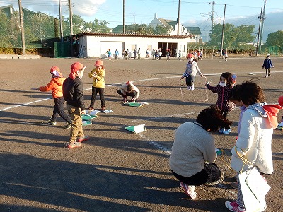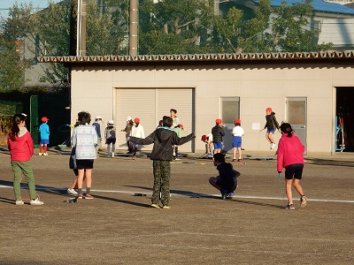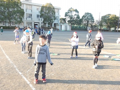 縄跳びカードが飛ばされそうな強い風ですが、子どもたちは元気に縄跳び運動に取り組んでいました。