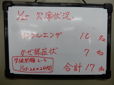 インフルエンザによる欠席者10名(昨日と比べ−10)、風邪様の症状での欠席者が7名(同−8)、合計17名(同−18)です。