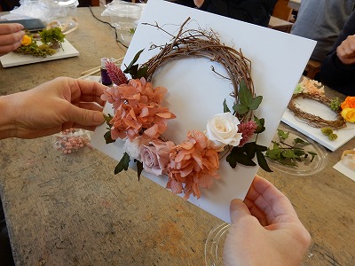冷えると固まるボンドを使って、細いつるで作ったリースにバランスや色合いを考えながらブリザードフラワーをつけていきました。
