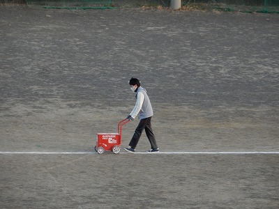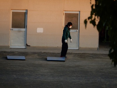 先生方は、運動場にラインを引いたり、縄跳び練習用のボードを出してたりしていました。