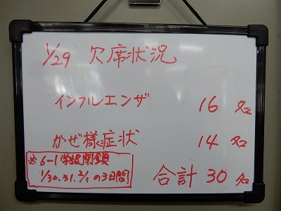 インフルエンザ等の状況 (1月29日) 『6年1組が1/30,31,2/1学級閉鎖』