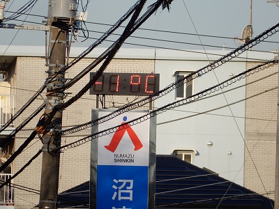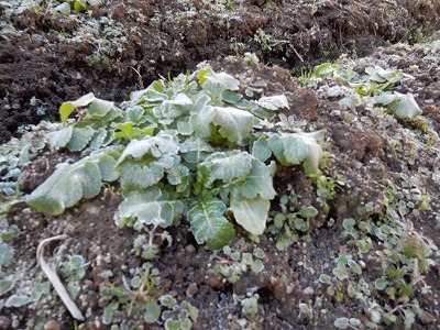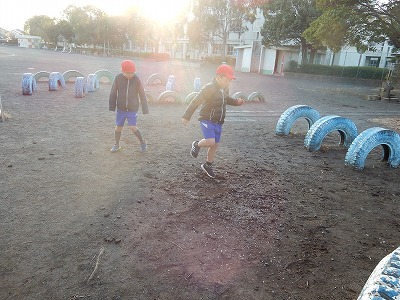 花壇には霜柱が立っていました。運動場の西側の地面にも霜柱があり、男の子が霜柱を分で感触を楽しんでいました。