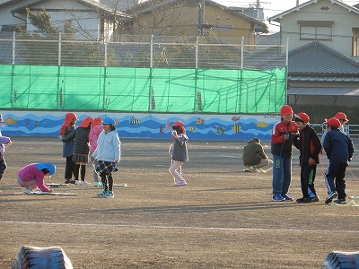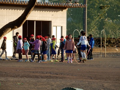 寒さに負けず、縄跳び運動などで体を動かしていました。