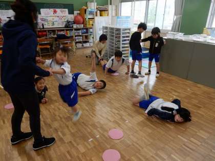 今日はグラウンドが使えないので、室内でジャンプしてからの足ジャンケンや腕立て伏せなどに取り組みました。