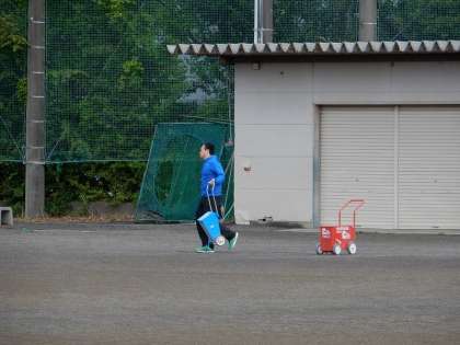 先生が、昨日の雨で薄くなったラインを引き直していました。