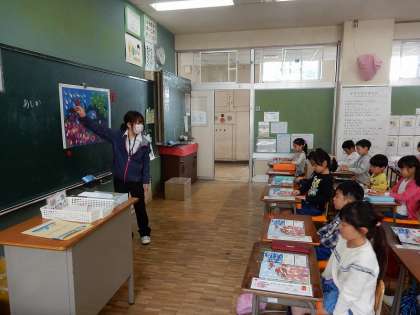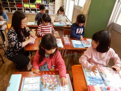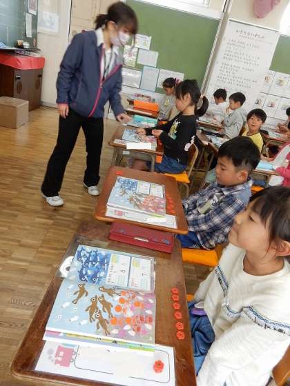 教科書のイラストにおはじきを置いて、そのおはじきを並べて数を確認しました。