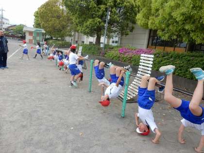 鉄棒のいろいろな技に挑戦しました。