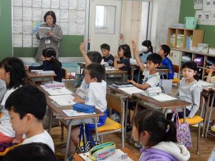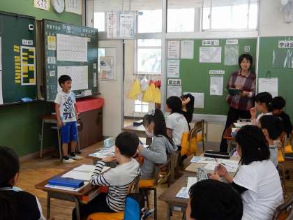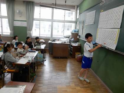これまで学習したかけ算のきまりを使って、「10×5」「5×10」の答えの出し方を考えました。