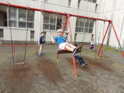 中庭では、1年生と6年生とが遊具で遊ぶ姿が見られました。